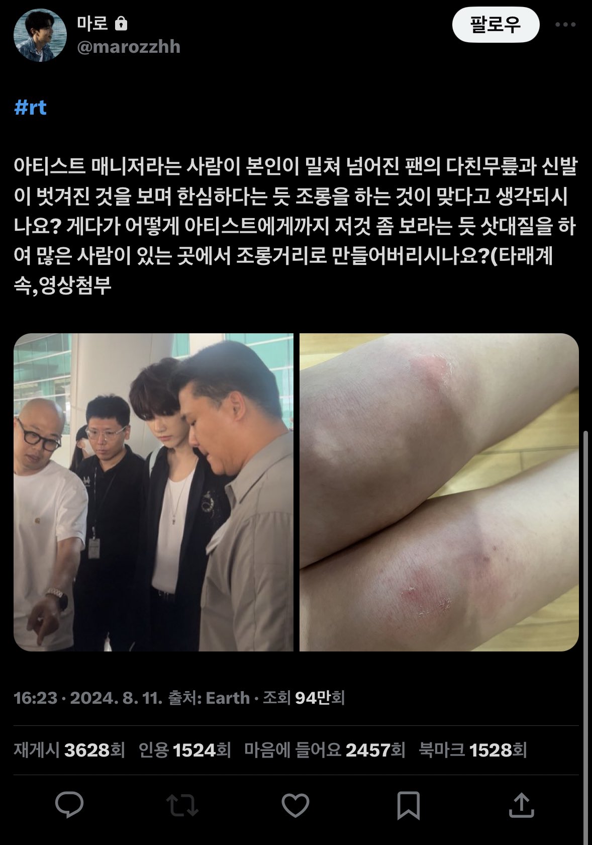 Do you think it's right for a person called an artist manager to mock a fan who he pushed down and see his injured knee and torn off shoe? Moreover, how can you make an object of ridicule in front of many people by pointing a finger at the artist as if to ask him to look at that?