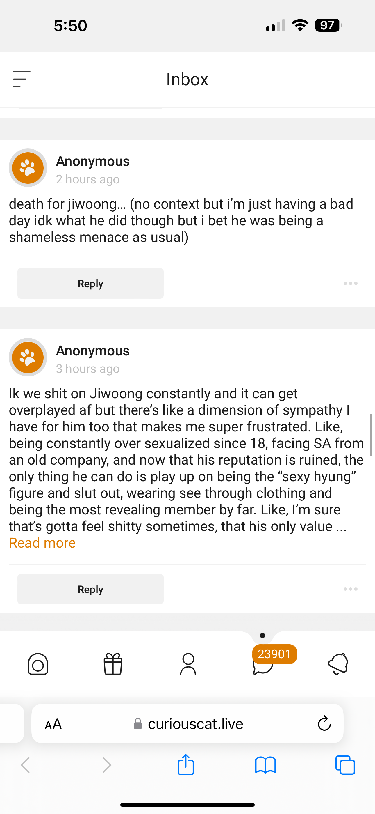 yea I can understand all that and I do feel sympathy but all the other shit he does on top just makes me not extend it he shows no remorse no effort no relationships I'm pretty neutral on him at this point and I take both sides into consideration but from what we're being shown in the present it's not looking too hot Godspeed to him tho post disbandment I don't wish any bad on him he most likely gets paid the most in the group too like oh ok u got all the bread 😒 but this is just funny lmaooo https://files.catbox.moe/22xwfd.png